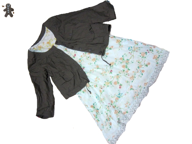 ジャケット羽織っただけ。このワンピ鳥がいたり可愛いんですよ。レースも付いてるし。雰囲気大人っぽいし。