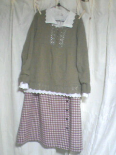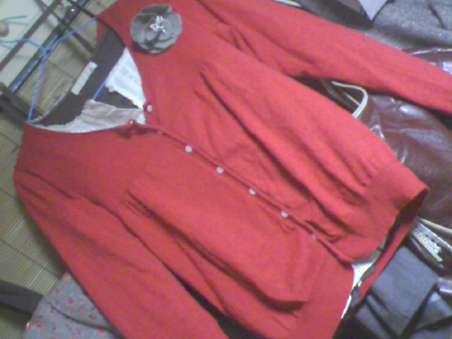 寒いので3枚重ね(茶のクルーネック+キナリクルーネックボタン開け+赤ニットボタン開け+コサージュ)